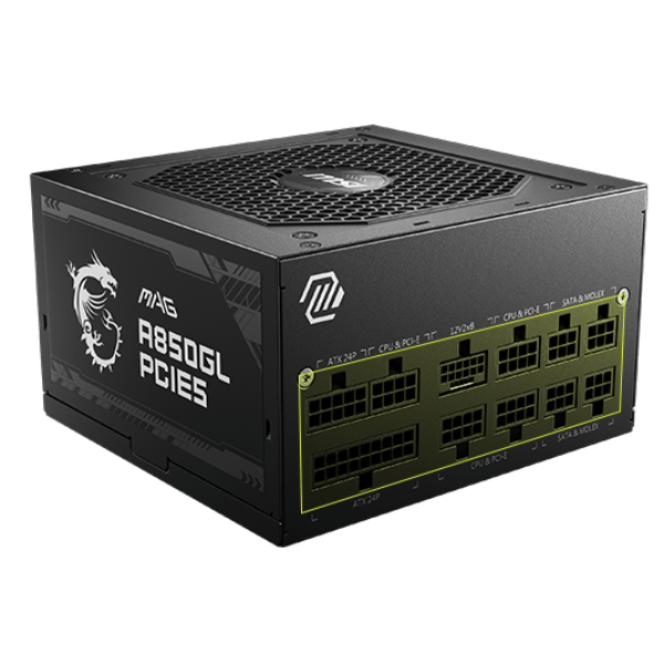 منبع تغذیه MSI MAG A850GL PCIE5 با سازگاری با ATX 3.0 و کانکتور PCIe 5.0 برای پشتیبانی از کارت‌های گرافیک سری NVIDIA GeForce RTX™ 40 طراحی شده است. این منبع تغذیه دارای توان 850 وات است، دارای گواهینامه 80 PLUS Gold برای بهره‌وری بالاست و طراحی کاملاً ماژولار با کابل‌های تخت دارد.
