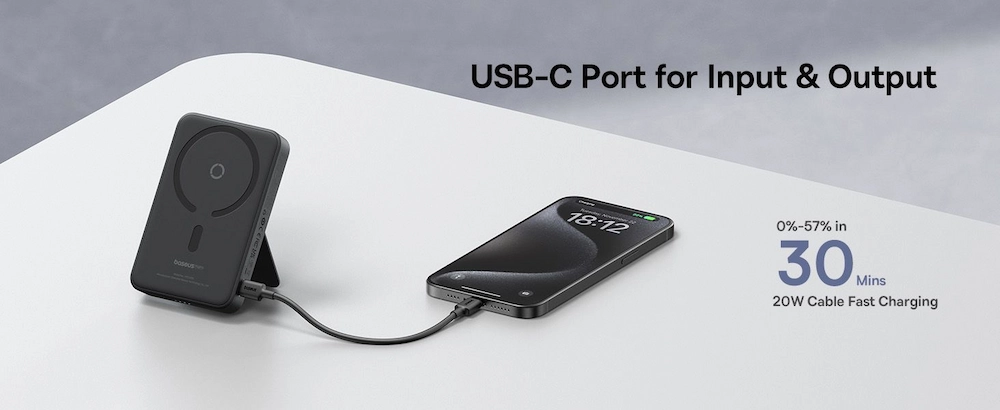 علاوه بر شارژ بی‌سیم، خروجی Type‑C با توان PD 20 W شارژ سریع گوشی را در مدت ۳۰ دقیقه تا ۵۰٪ امکان‌پذیر می‌سازد.