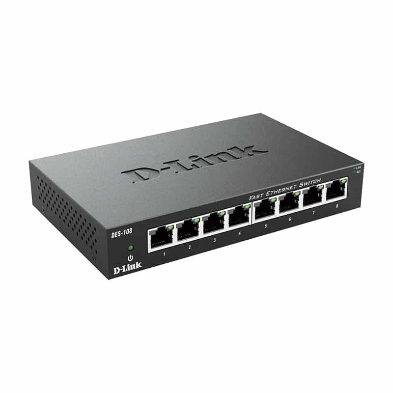 سوییچ DES-108 یک سوییچ رو میزی با قاب فلزی است که با پنج پورت با سرعت 10/100 مگابیت بر ثانیه یک راهکار سریع، آسان و مقرون به صرفه برای راه اندازی شبکه های با سرعت بالا در دفاترخانگی، کسب و کارهای کوچک و متوسط فراهم میکند. این سوییچ به شما این امکان را می دهد به سرعت یک شبکه کابلی را راه اندازی کنید. با وصل کردن DES-108 به چندین سیستم میتوانید فایل ها و اطلاعات را به اشتراک بگذارید، یا با اتصال سوییچ به روتر اینترنت را به اشتراک بگذارید. پورت های این سوییچ از قسمت جلویی در دسترسی هستند. هر کدام از پورت های دارای نشانگر LED هستند که وضعیت پورت را نشان میدهد. این سوییچ با بهره مندی از استاندارد 802.3az دستگاهی سازگار با محیط زیست محسوب می شود.