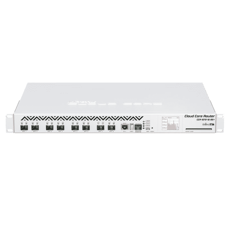 روتر CCR1072 پرچمدار جدید میکروتیک است . این روتر مجهز به پردازنده ی 72 هسته ای Tilera است که قدرت پردازش هر هسته 1GHz می باشد. برای استفاده از این قدرت بی نظیر این دستگاه مجهز به 8 درگاه +SFP با قابلیت پشتیبانی تا سرعت 10GB و یک پورت شبکه است . این دستگاه از سیستم عامل با سطح دسترسی L6 ،میزان حافظه رم 16GB، صفحه نمایش لمسی رنگی ، درگاه سیم کارت ، پورت microUSB ، پورت USB و دو پورت M.2… بهره می برد .