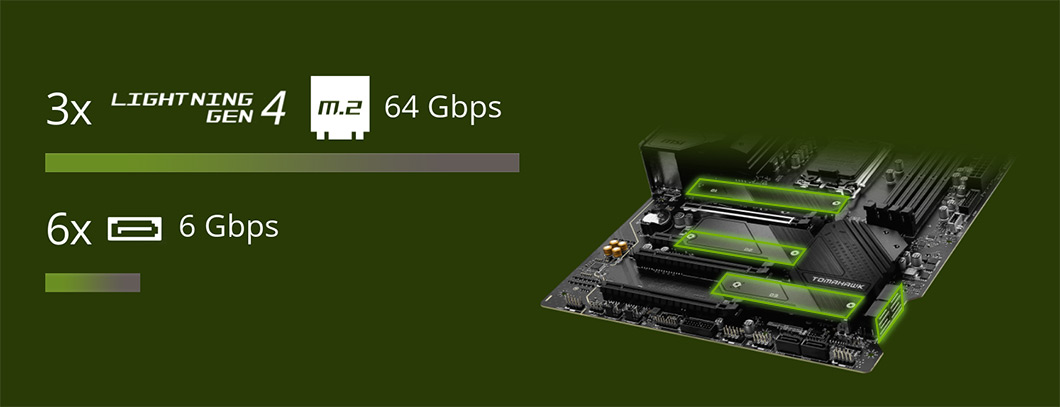 مادربردهای MSI B660 با استفاده از نسل دوازدهم پردازندههای اینتل، از فناوری PCIe Lightning نسل 4 پشتیبانی میکنند که سریعترین سرعت را در بین حافظههای M.2 در اختیار کاربر قرار میدهد. تا 64 گیگابایت بر ثانیه!