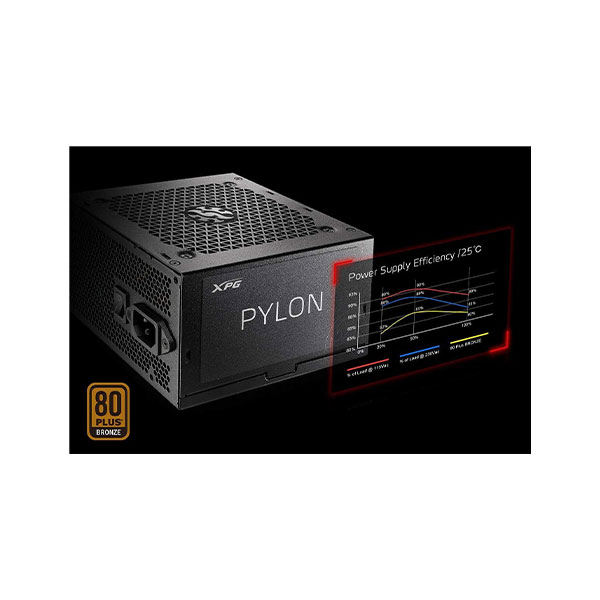 XPG PYLON یک منبع تغذیه با گواهی 80 Plus Bronze است که بهرهوری انرژی را در تمام سطوح بار تضمین میکند. همچنین مطابق با مقررات ErP 2014 Lot 3 بوده و برای عملکرد پایدار 24/7 طراحی شده است.